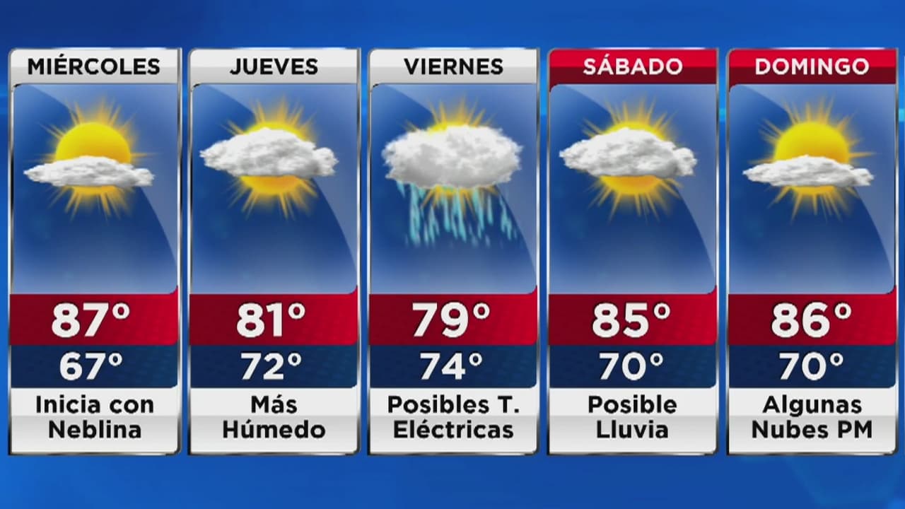 Aunque en la mañana estará presente la neblina, la mayor parte del día será soleado y con nubes ligeras. Además, después de varios días de temperatura moderada, hoy regresa el calor de verano. La máxima será de 87 grados, con sensación térmica que llegaría a los 95 grados.