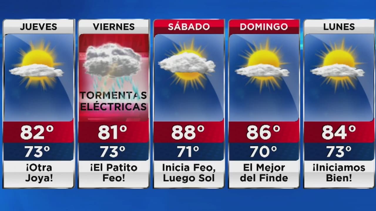 Este jueves disminuye la humedad y el calor, por lo que se espera un día agradable. Aunque habrá algunas nubes, el sol estará resplandeciente durante toda la jornada. La temperatura máxima será de 82 grados.
