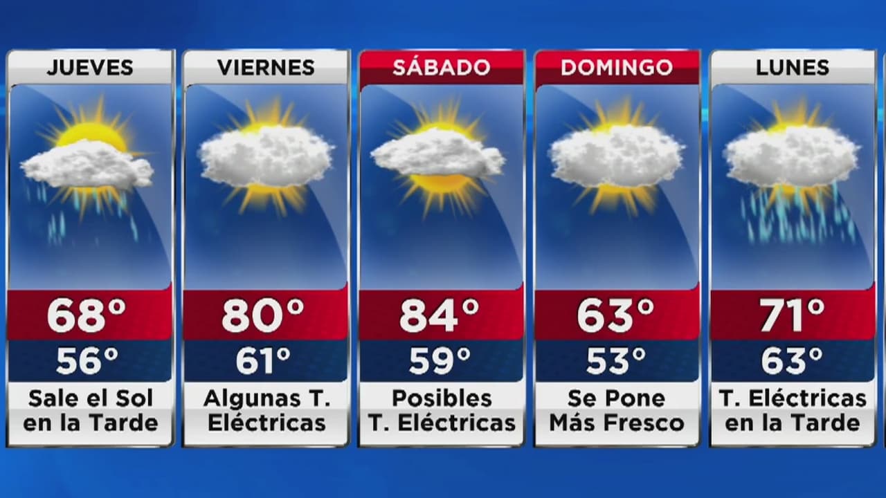 Este jueves amanece nublado y con una lluvia ligera, que se podría extender hasta aproximadamente el mediodía. El cielo se mantiene nublado y la temperatura máxima será de 68 grados y en la noche bajará hasta los 58 grados.