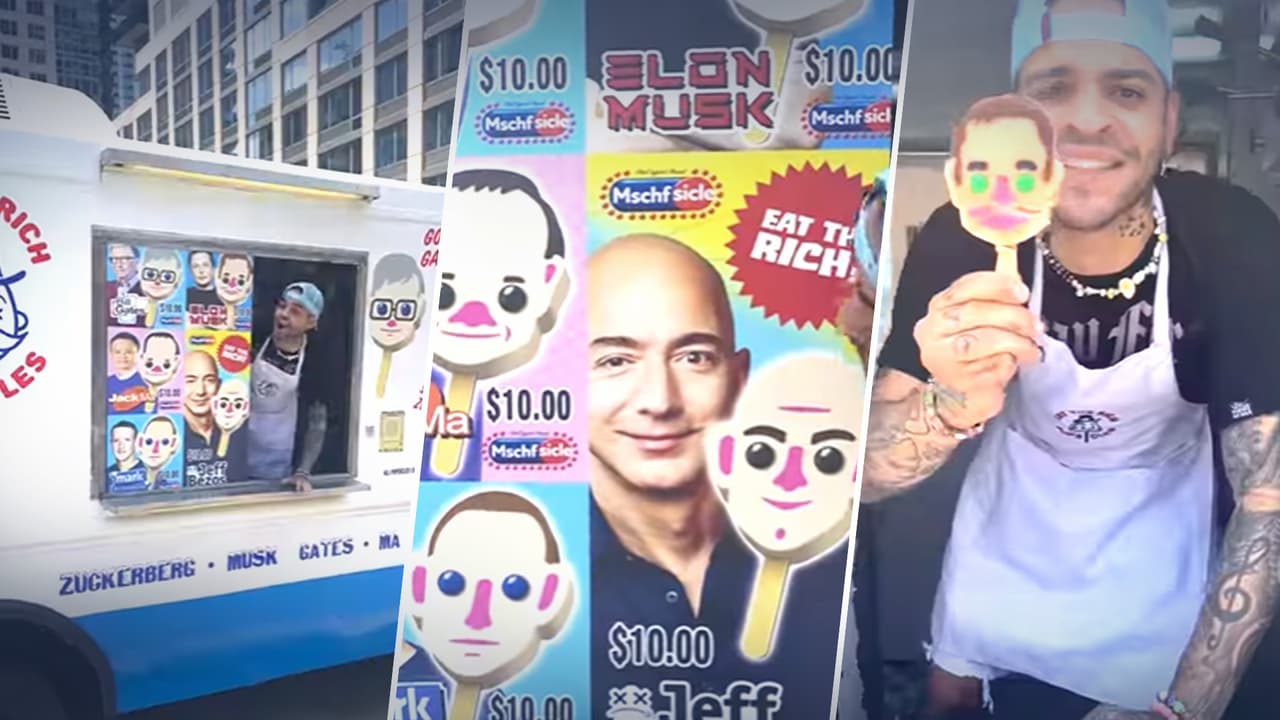 El colectivo de arte MSCHF ha creado una paleta helada “Eat the Rich” como parodia al capitalismo. Las paletas tienen la cara de los multimillonarios más famosos del mundo en miniatura, como Elon Musk y Jeff Bezos y se venderán inicialmente en New York y Los Ángeles.