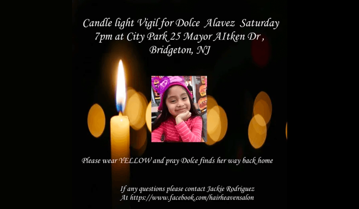 El miércoles, la madre publicó en Facebook un volante invitado a toda la comunidad a una vigilia para la pequeña en Bridgeton, en el mismo parque donde fue vista por última vez jugando con su hermano, antes de desaparecer.