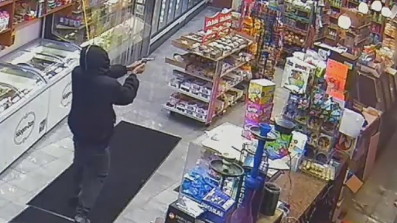 Un video de seguridad difundido por las autoridades muestra el momento en que un sujeto armado ingresa a una tienda Deli, acompañado de dos presuntos cómplices, y amenaza a un trabajador del establecimiento. Los hechos ocurrieron el pasado viernes en el vecindario de Jamaica.