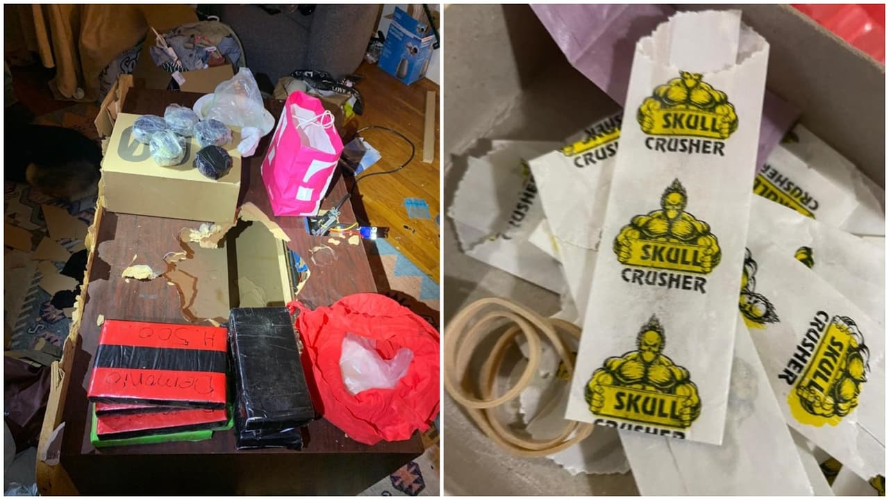 En uno de los dormitorios había una caja de zapatos con una cantidad adicional de fentanilo y heroína. Sobres de cristal listos para venta callejera con el sello de la marca “ Skull Crusher”, además de bolsas de plástico con las mismas drogas.