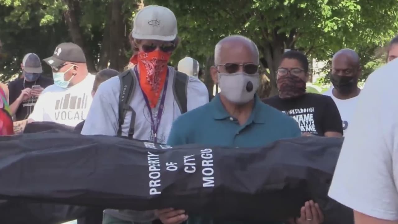 Dejando bolsas para cadáveres frente al capitolio de Nueva York, activistas exigen una reforma penitenciaria