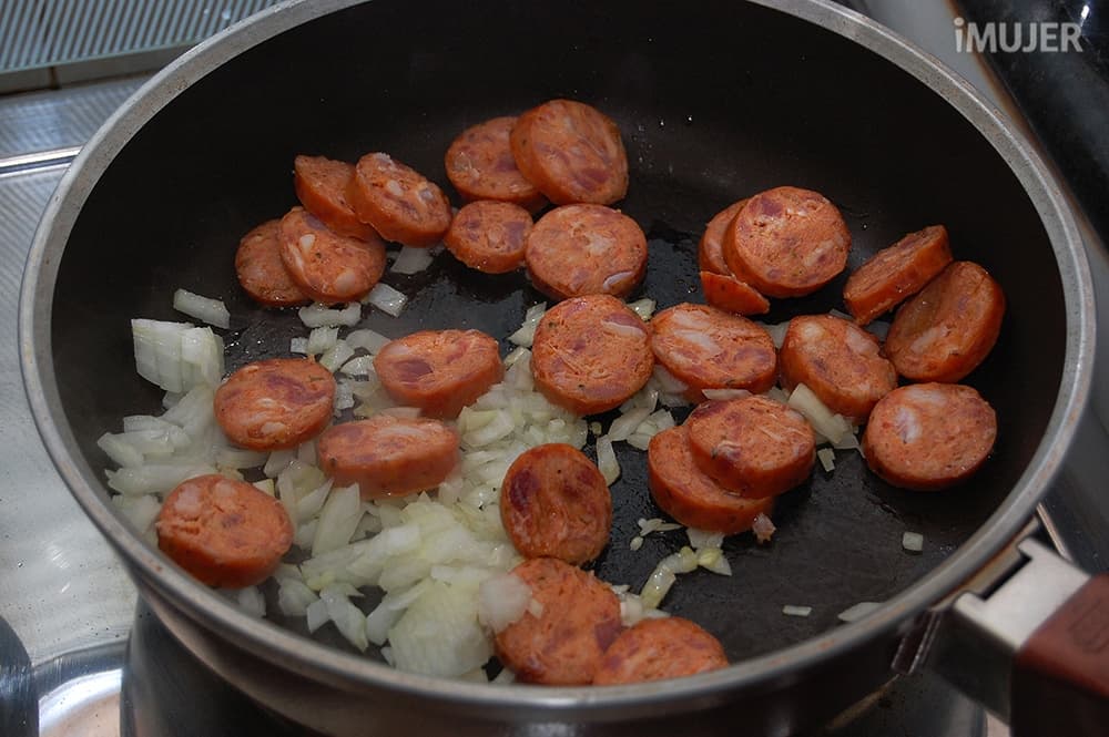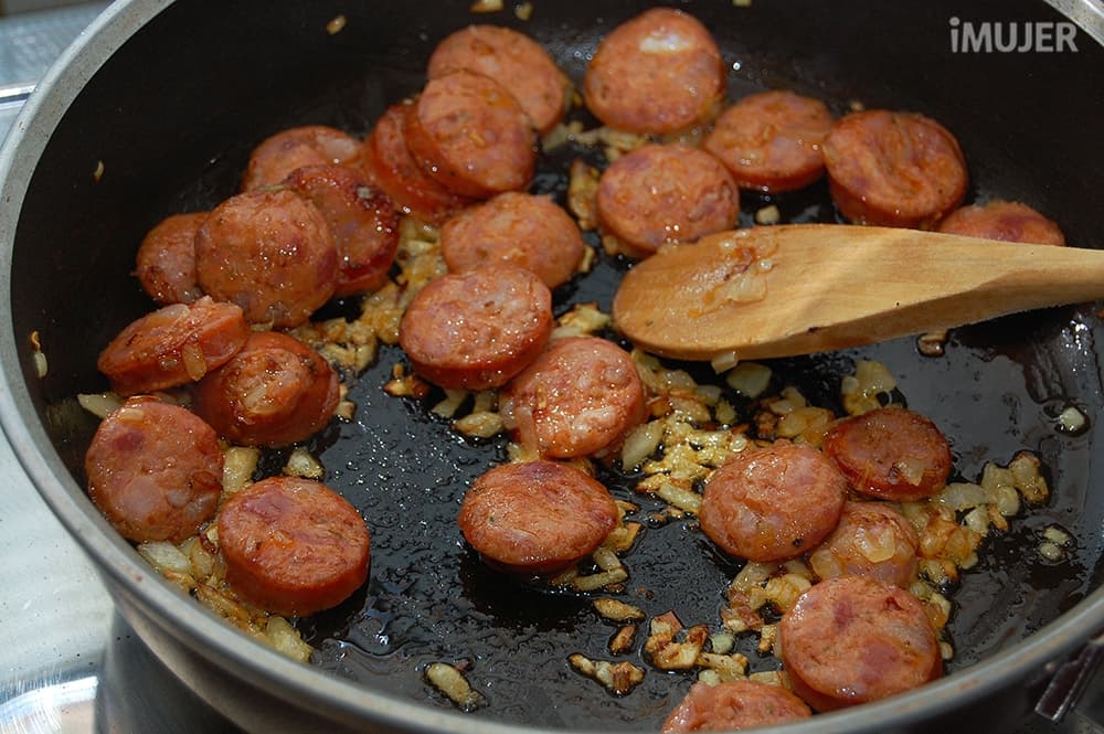 Dora la cebolla y los chorizos en un sartén amplio, puedes agregar un poco de aceite antes de comenzar, pero la verdad es que los chorizos tienen bastante materia grasa.