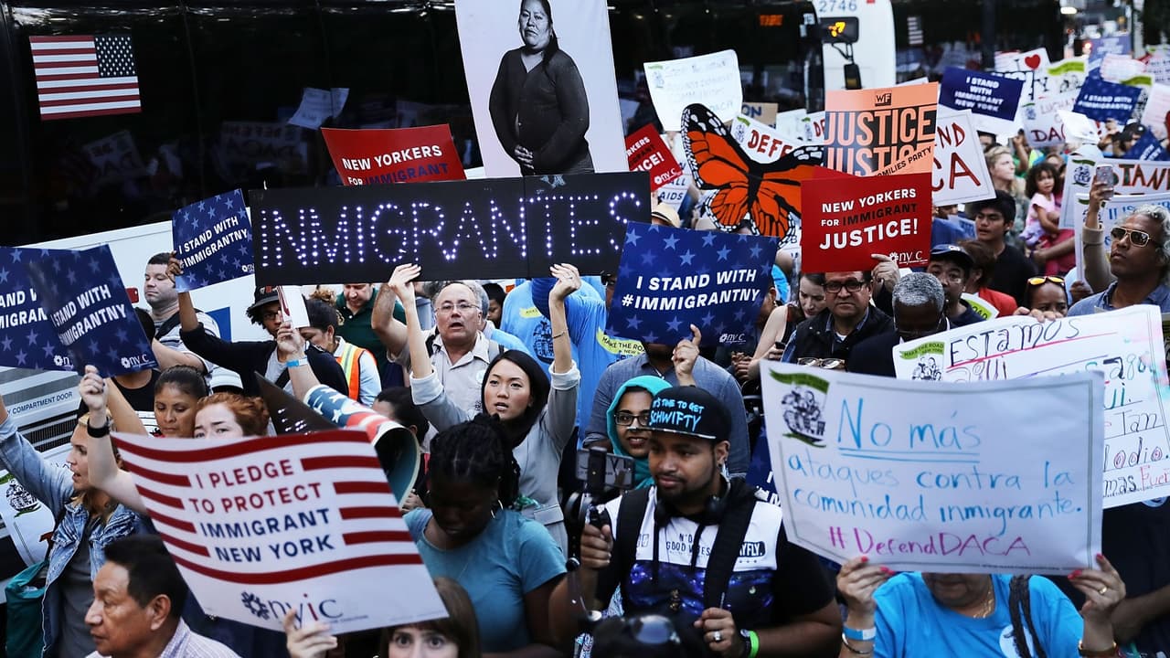 Con pancartas, pitos y arengas, cientos de personas en Manhattan se manifiestan en contra de la decisión del presidente Donald Trump de finalizar DACA, el programa que beneficia a unos 800,000 dreamers en el país.