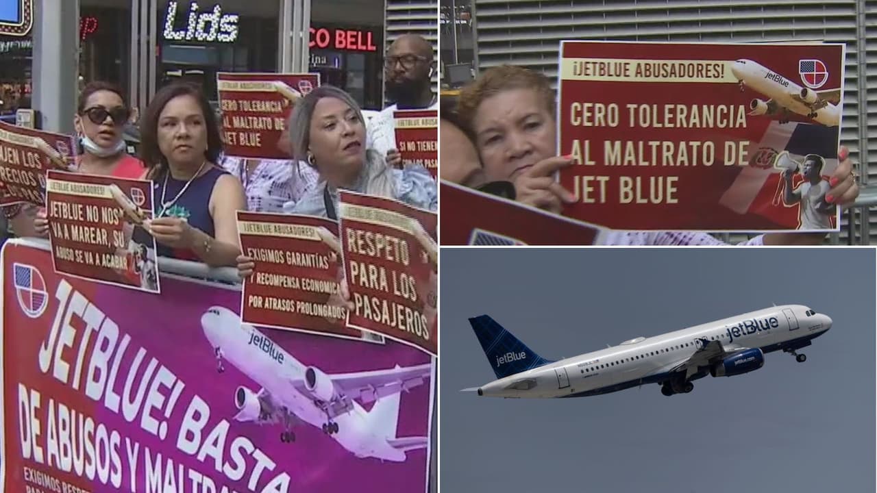 Decenas de dominicanos llegaron hasta el Times Square en Nueva York para protestar en contra del servicio prestado por la aerolínea JetBlue. De acuerdo con los manifestantes, la empresa les ha cancelado vuelos sin previo aviso y sin darles ningún tipo de compensación, además de otros atropellos. La protesta, que se espera que siga hasta el Congreso de Estados Unidos, se realizó el día que la compañía anunció un importante acuerdo de compra.