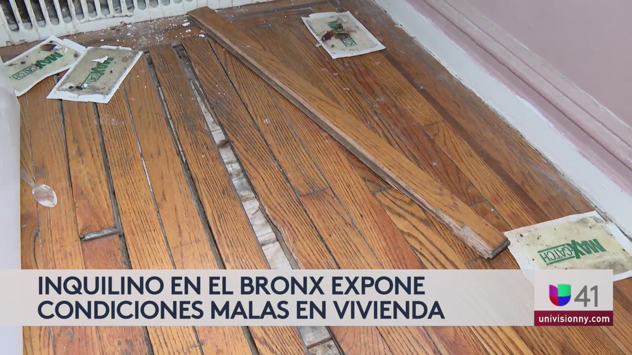 Un inquilino hispano en un edificio de El Bronx expone las malas condiciones de la vivienda que renta. Afirma que el casero no responde, pero el superintendente del edificio dice que el inquilino rompe el piso a martillazos.