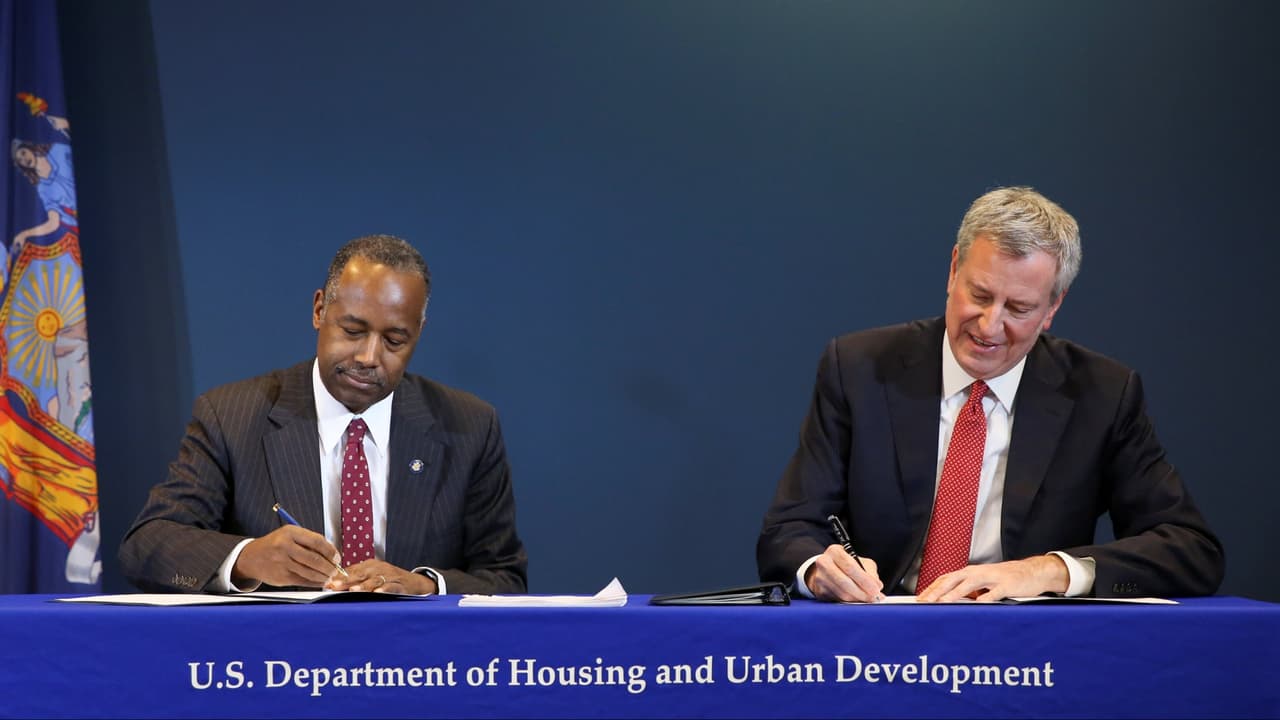 El alcalde Bill de Blasio y el secretario del Departamento de Vivienda y Desarrollo Urbano, Ben Carson, firmaron este jueves un acuerdo en el que la ciudad de Nueva York se comprometió a invertir 2,200 millones de dólares en los próximos 10 años para renovar 175,000 apartamentos.