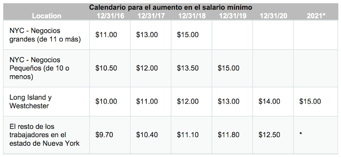 El gobernador Cuomo anunció hoy miércoles que el aumento del salario mínimo en Nueva York entrará en vigor el próximo lunes, 31 de diciembre. Este cambio aplicaría a los negocios grandes en la Ciudad de Nueva York, y verá un incremento gradual en el resto del estado.