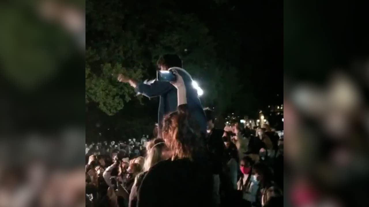 Uno de los asistentes no resistió y aprovechó la calidad noche de otoño para bailar bajo el agua de la icónica fuente de la plaza que está cerca de la NYU.
