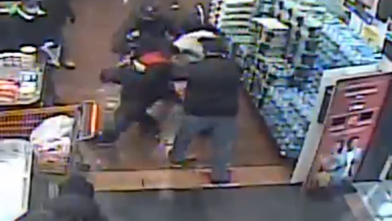 Un video muestra cómo sucedieron los hechos. Los dos trabajadores de la tienda salieron heridos, mientras que los ladrones escaparon. Ahora la policía anda tras su pista.