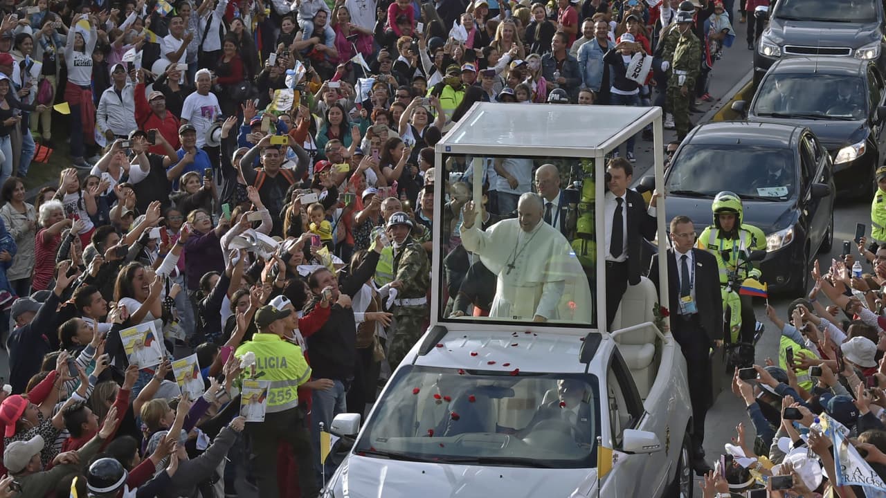 Miles de fieles se volcaron a la Avenida El Dorado, también llamada Calle 26, para saludar al sumo pontífice. Con el lema "Demos el primer paso", el papa Francisco presidirá masivas concentraciones con feligreses en Bogotá, Villavicencio, Medellín y Cartagena.