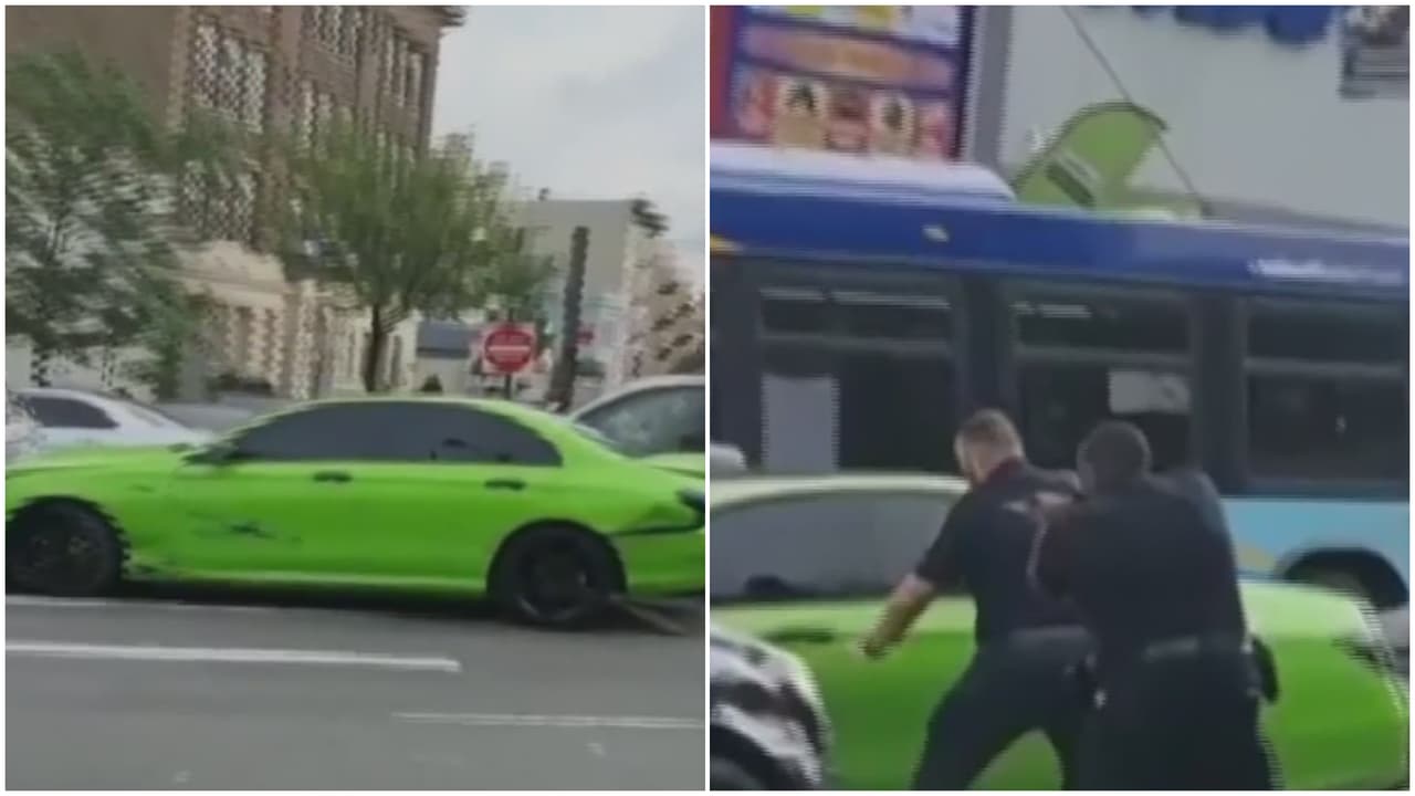 El reporte indica que el chofer de un automóvil color verde fosforescente fue descubierto por la policía presuntamente con marihuana. Los oficiales trataron de detener al sujeto, pero este los evadió, desatando una persecución a plena luz del día. Posteriormente, le exigieron salir del vehículo, pero este se negó y empezó a manejar en reversa, chocando a otros autos que estaban en la vía.