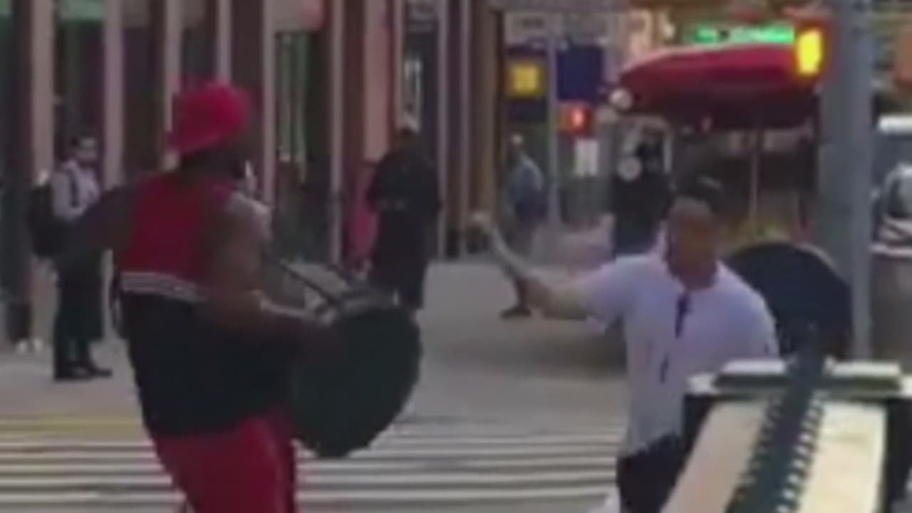 En video, peatón se defiende con un basurero del ataque de un hombre con un machete