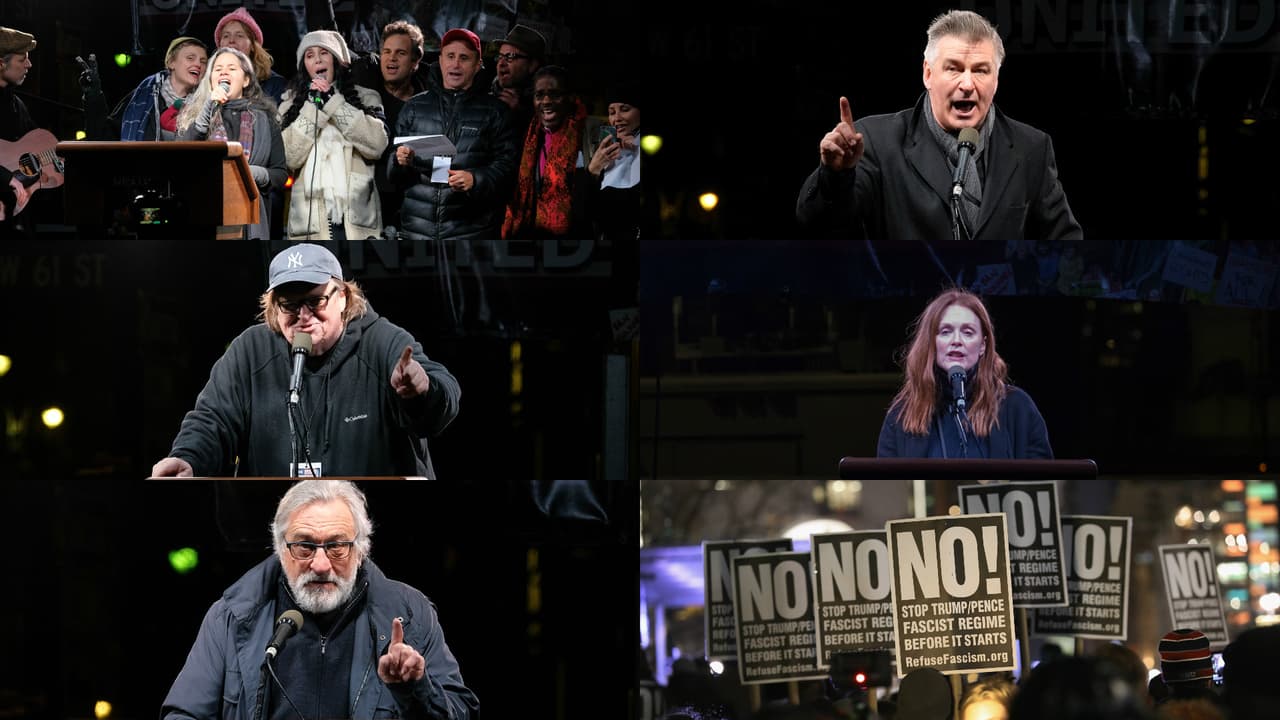 Michael Moore, Robert De Niro, Mark Ruffalo, Alex Baldwin, Cher, Julianne Moore, entre otros, se reunieron en Columbus Circle para decirle al próximo Presidente de Estados Unidos que lucharán por la justicia social.