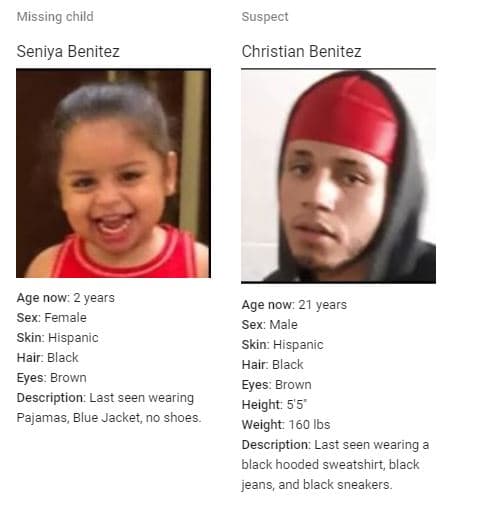La policía había identificado al sospechoso como Christian Benitez, el padre biológico de la menor, que no tiene permiso de mantener contacto con la niña sin supervisión.