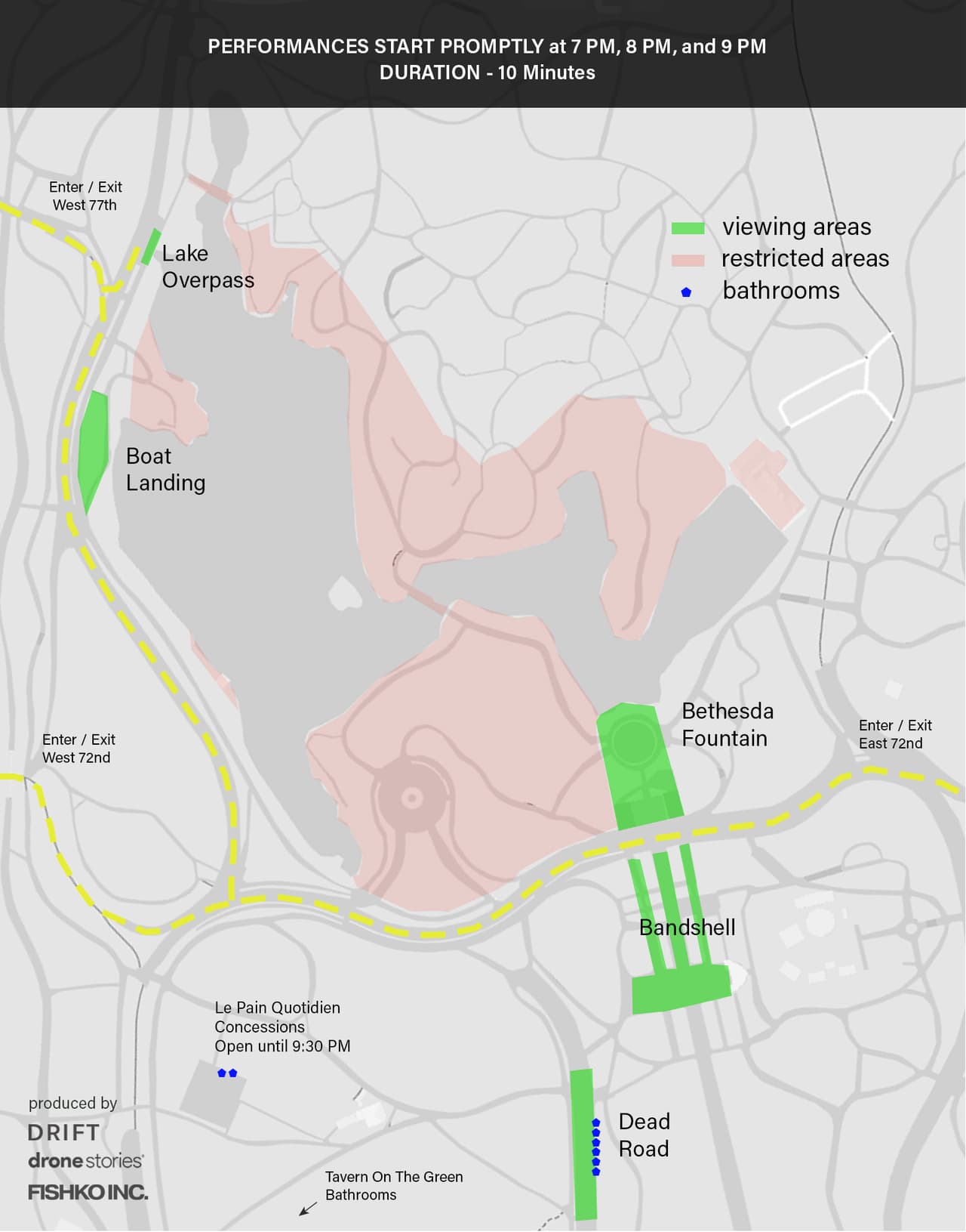 Los mejores puntos para poder ver el show de drones son la fuente de Bethesda, la Concha acústica, el puente sobre el lago y el muelle oeste.