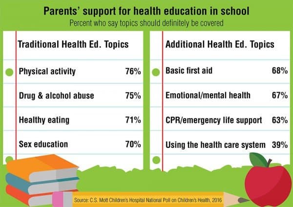 Dos tercios de los padres encuestados respondieron que definitivamente las escuelas deben ofrecer educación sobre temas de salud mental y emocional, algo que requeriría hablar de depresión, estrés y acoso escolar. Otro 68 por ciento de los padres considera que sus hijos se benefician en la escuela si reciben entrenamiento de primeros auxilios y mientras que un 63 por ciento quieren que sus hijos aprenden en la escuela cómo hacer CPR.