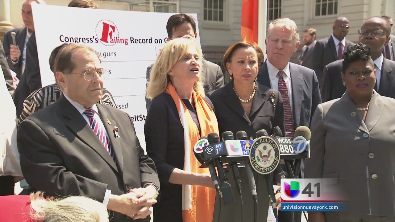 Activistas y congresistas se manifestaron frente a la alcaldía de NY para exigir leyes que dificulten la venta de armas de fuego, y así evitar ataques.