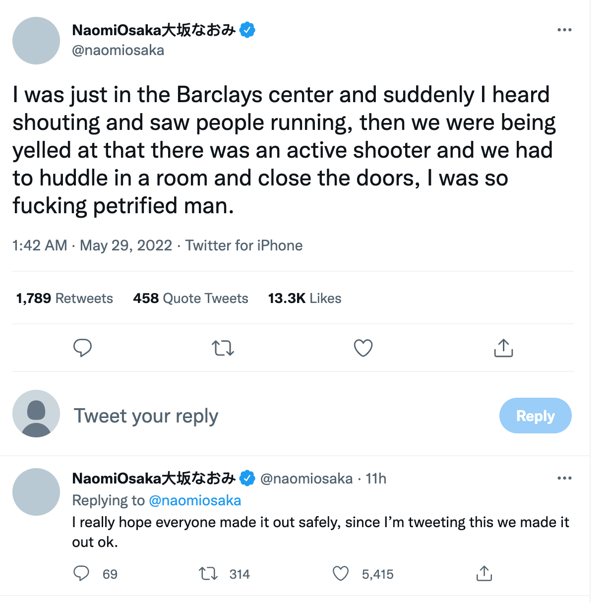 La jugadora de tenis Naomi Osaka escribió en Twitter que estaba dentro del Barclays Center cuando “escuchó gritos y vio gente corriendo”, antes de que le dijeran “que había un tirador activo y tuvimos que acurrucarnos en una habitación y cerrar las puertas”.
