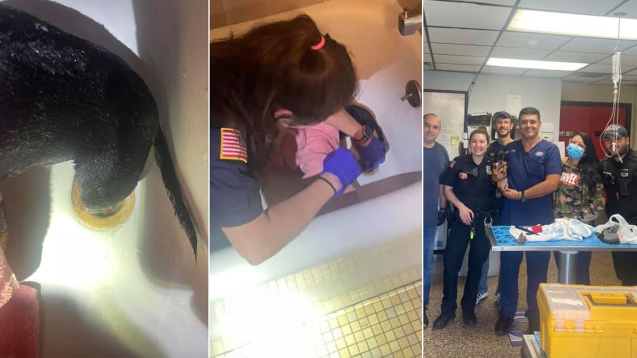 La policía de Westchester, Nueva York, fue llamada a una casa después de que un cachorro se quedara con la pata atascada dentro del desagüe de una bañera, según las autoridades.