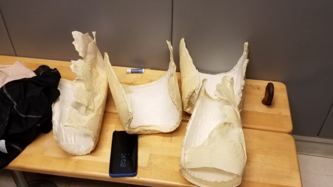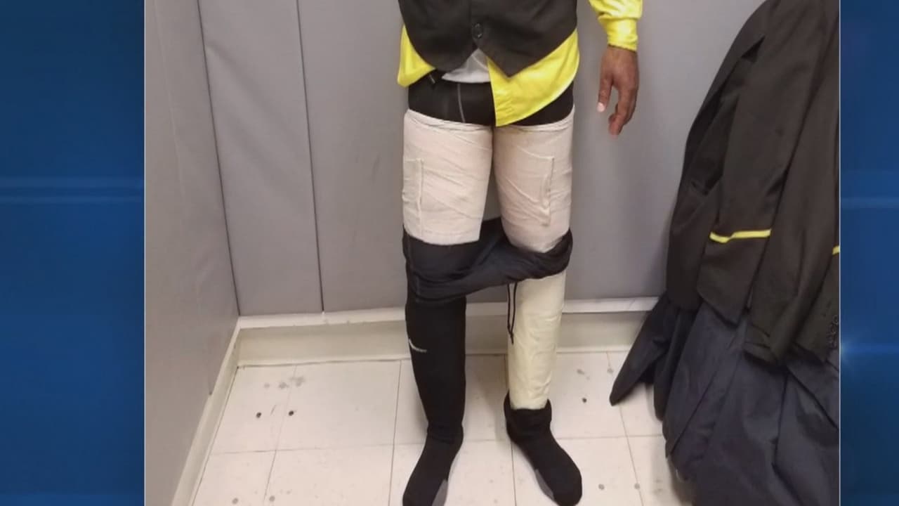 Los paquetes, que estaban pegados a sus piernas, fueron llevados a un examen que dieron positivo de cocaína. Posteriormente, el sujeto fue arrestado y entregado a la oficina de Investigaciones de Seguridad Nacional.