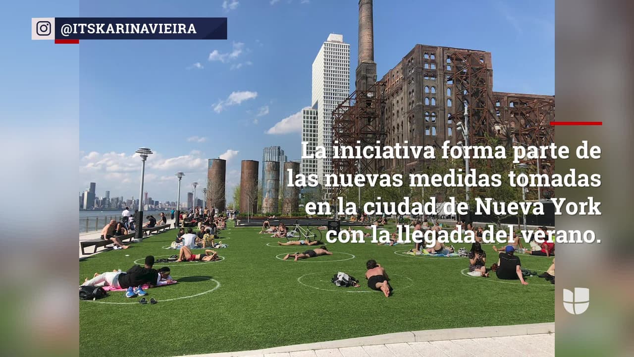 El Domino Park, en Brooklyn, se ha llenado de círculos en el césped que marcan el terreno que cada persona debe ocupar, manteniendo de esa forma, la distancia social requerida en la ciudad.