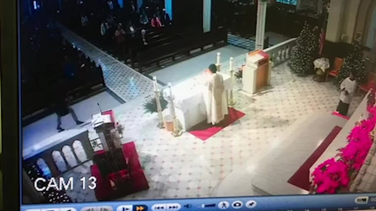 En el video se ve cómo un sujeto se acerca al altar mientras el Padre Jossy Vattothu de la Iglesia San Antonio de Padua --en Avenida Manhattan en Greenpoint--, ofrecía la misa.