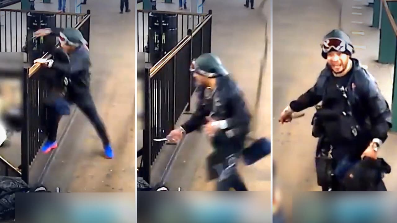 Un video que publicó el Departamento de Policía de Nueva York (NYPD) en sus redes sociales captó el momento exacto en que el sospechoso empuña un cuchillo largo y se lanza contra hombres que suben una escalera dentro de la estación, y hiere a uno.