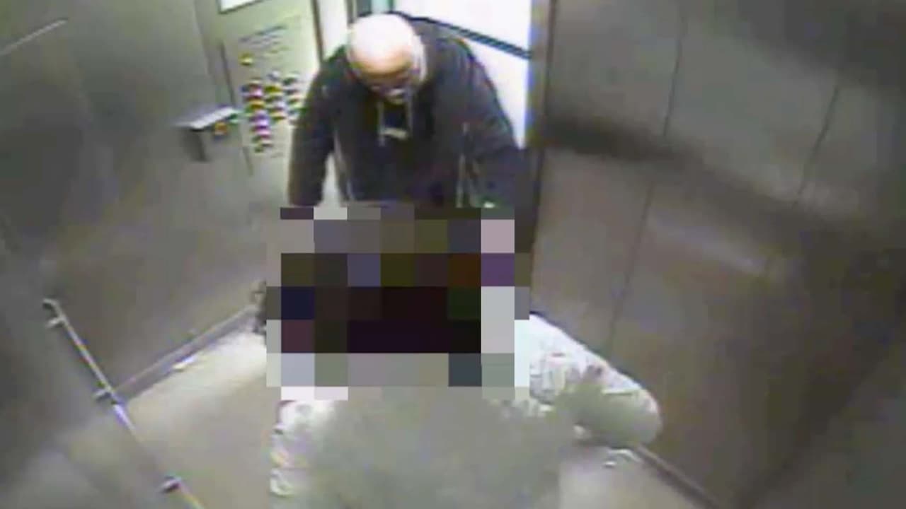 Un video muestra cómo el sospechoso hace que la mujer de 51 años coloque sus pertenencias en el piso del ascensor. La policía dice que después le bajó los pantalones y la abusó sexualmente.