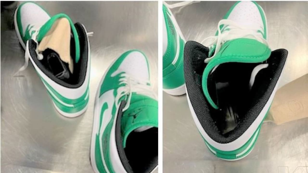 El arma, una pistola calibre .45 junto con un cargador lleno de balas estaban ocultos en unos tenis Air Jordan verde con blanco.