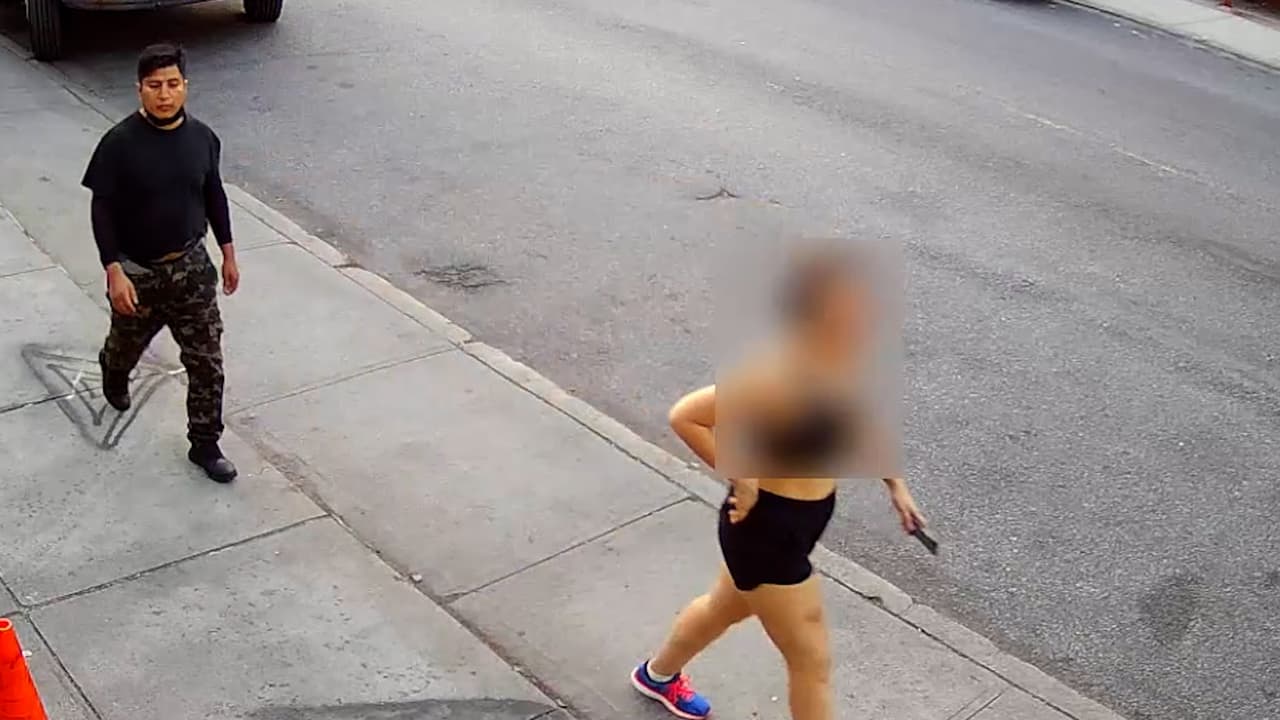 La mujer entonces giró hacia la calle Stagg y el individuo continuó siguiéndola. En el video puede verse cómo entonces el hombre corre y salta sobre la mujer, tumbándola al suelo.