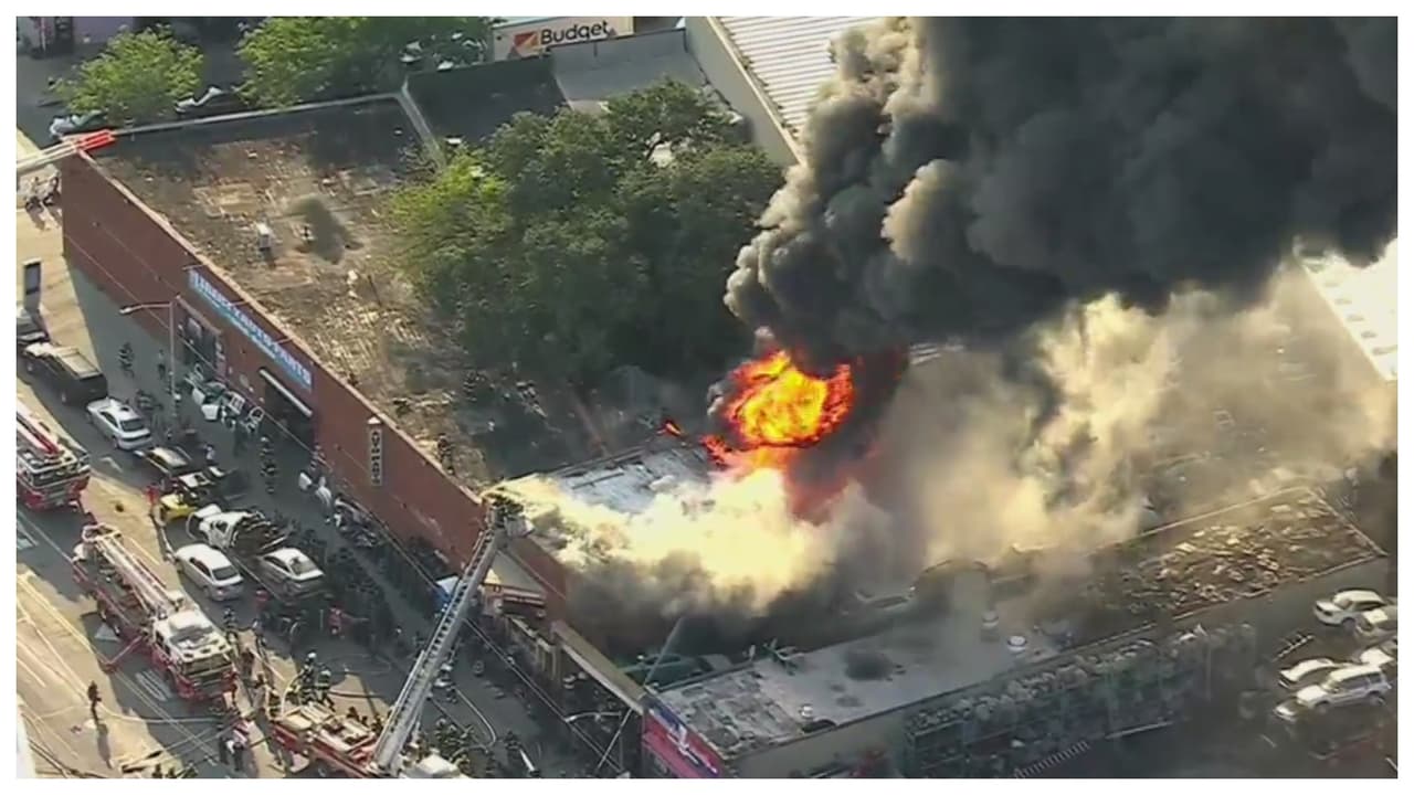 Bomberos luchan contra un incendio de gran magnitud en un taller de llantas en Jamaica, Queens. Hasta el momento se desconocen las causas de este hecho.