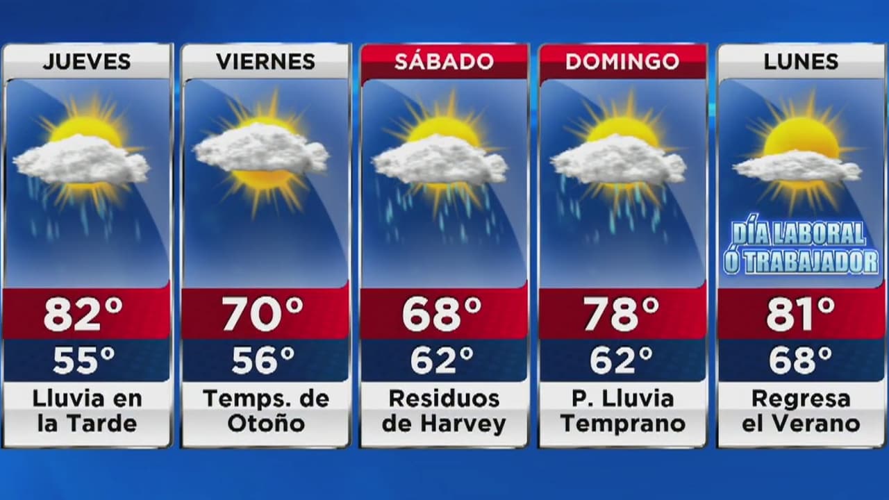 La mañana será soleada, pero entre las 3:00 y 4:00 de la tarde llegarán las nubes y la lluvia a la ciudad. La temperatura máxima para hoy será de 82 grados.