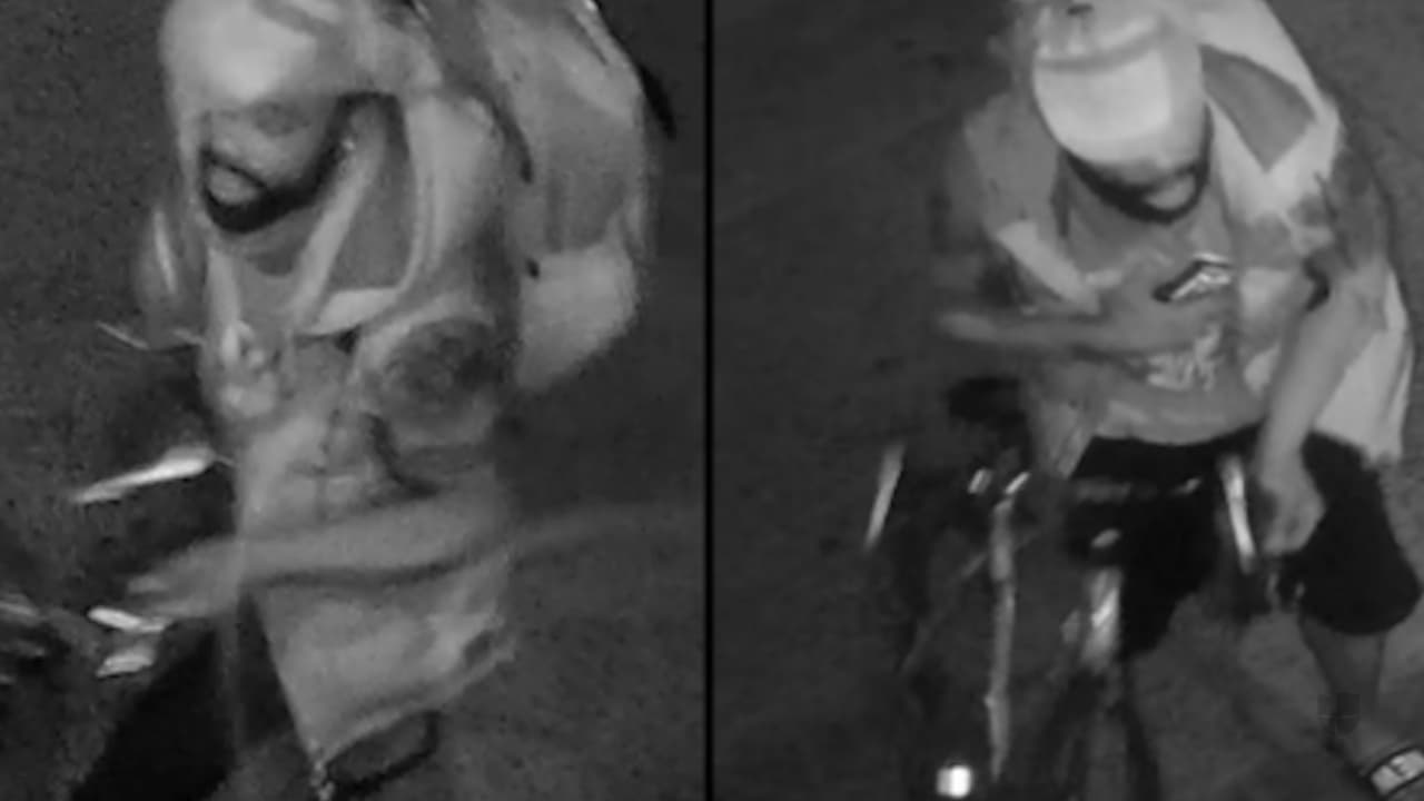 Como se ve en los videos de seguridad compartidos por Crime Stoppers, primero, el 11 de septiembre por la noche, el sospechoso se acercó en bicicleta a un hombre de 82 años que estaba sentado en un pórtico en las calles Prince y Thompson, en SoHo.