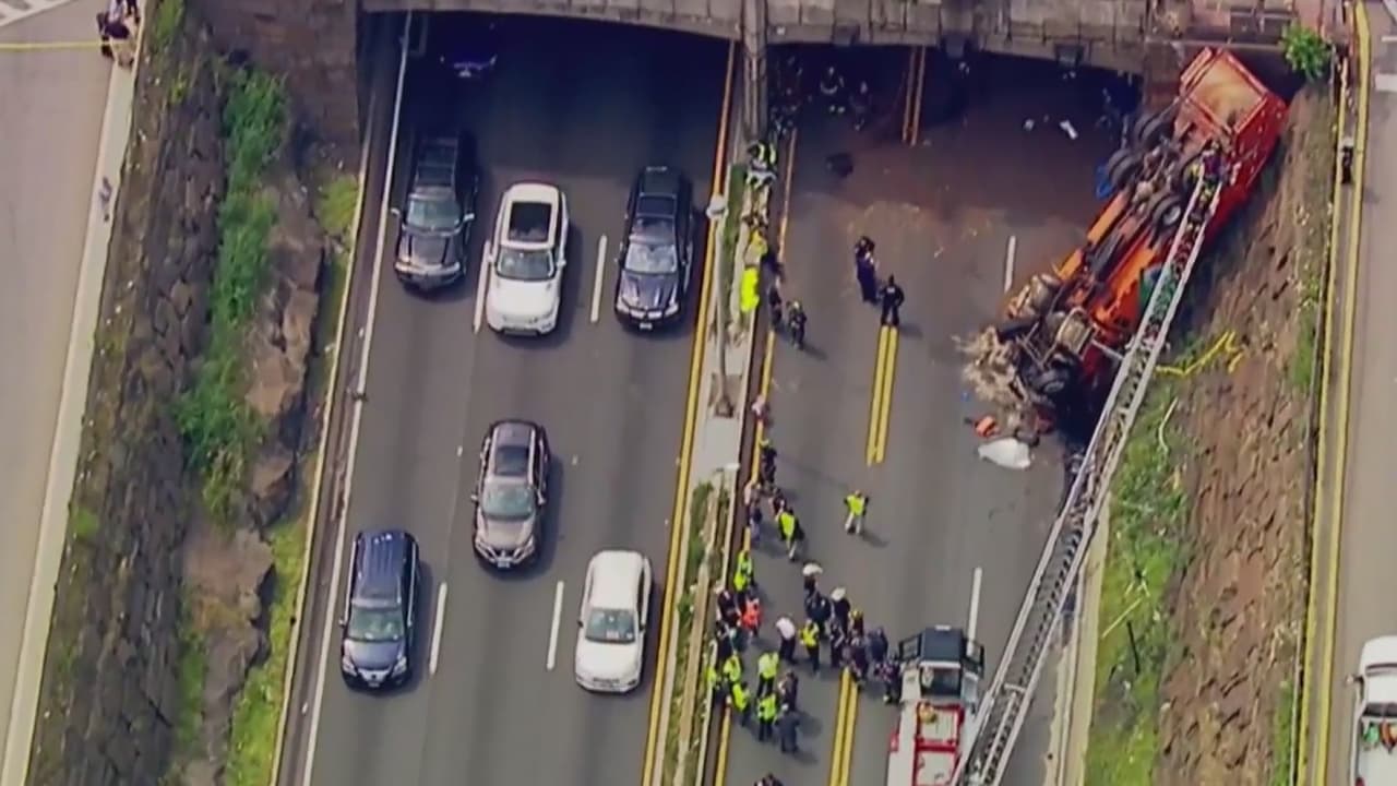 Las imágenes del accidente que sufrió un camión de basura en una avenida de Nueva Jersey al volcarse e impactar varios autos