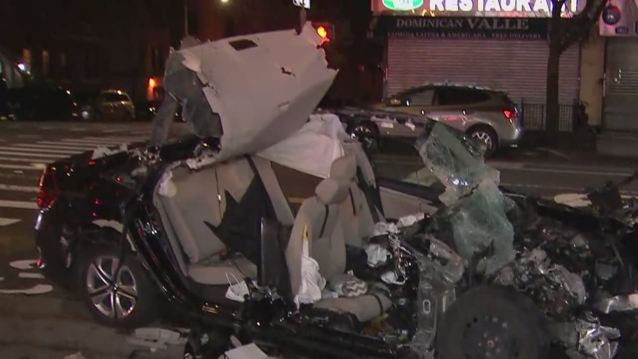 Las imágenes del violento accidente que sufrió un auto a toda velocidad contra un camión en Manhattan