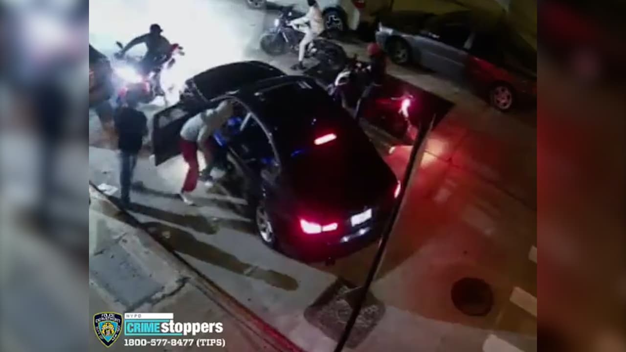 Estas son las sorprendentes imágenes de un automovilista que está tratando de salir de un estacionamiento, cuando varias motocicletas lo rodean y un sujeto, con pistola en mano, lo saca de su auto.