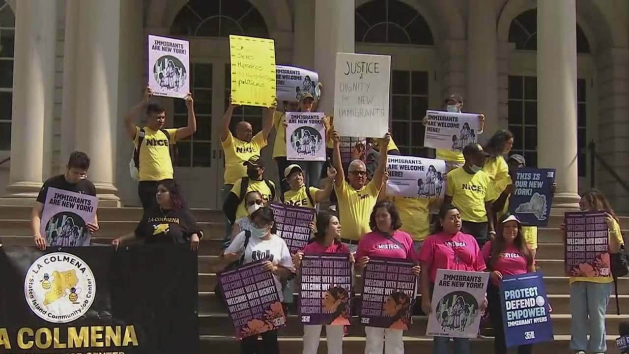 Los manifestantes pidieron frente a la alcaldía más apoyo para los inmigrantes que llegan en autobuses a Nueva York para solicitar asilo. La asambleísta Jéssica González y varios dirigentes hispanos asistieron a esta jornada que inició a las 11:00 am.