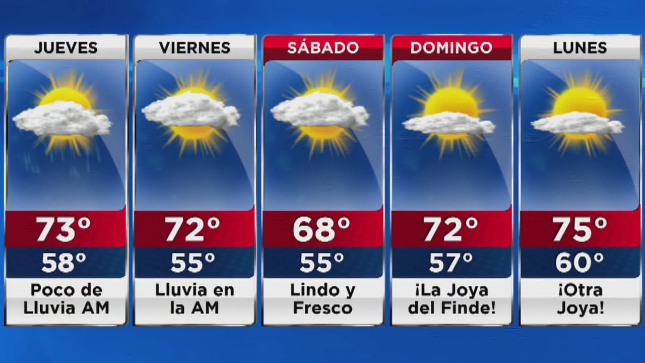 El día inicia un poco lluvioso, pero luego el cielo se despeja un poco y será un poco más soleado. La temperatura estará fresca, con una máxima de 73 grados. Los próximos días estarán ligeramente nublados.