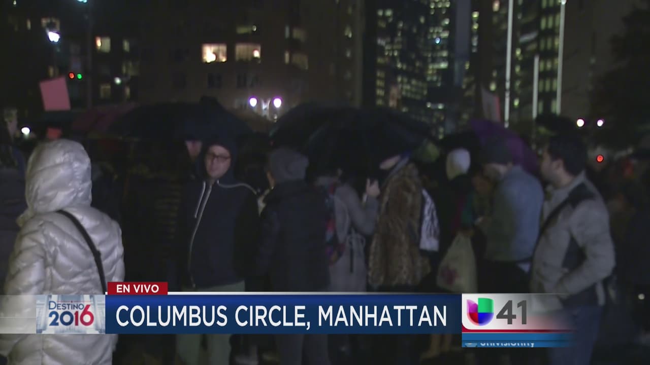 Un grupo de manifestantes se dio cita en Columbus Circle, en Manhattan, frente a uno de los edificios propiedad de Donald Trump, para mostrar su rechazo al presidente electo.