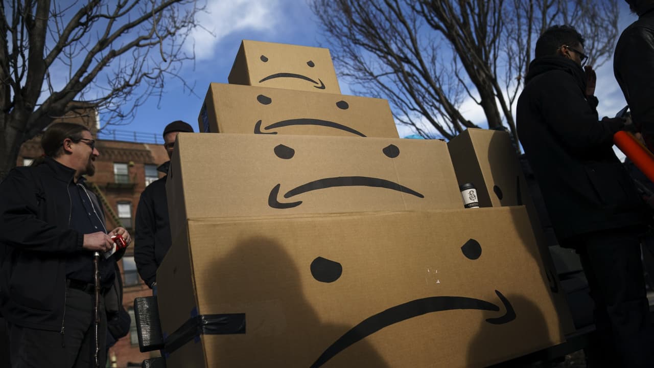 Manifestantes protestan frente a las futuras instalaciones de Amazon en Nueva York