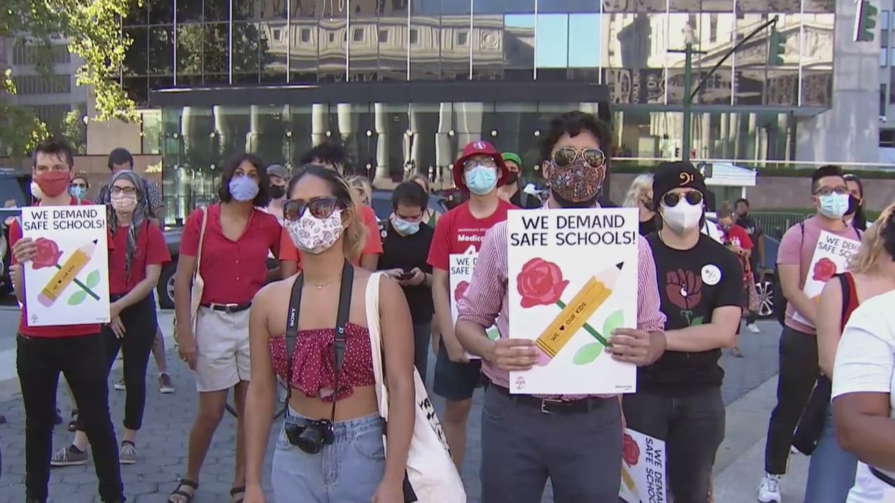 Padres de familia, estudiantes y docentes en Manhattan se congregaron este viernes para pedir que la educación sea completamente remota en medio de la pandemia. La comunidad dice que teme por la salud de los menores. Hablamos con los participantes en la movilización.