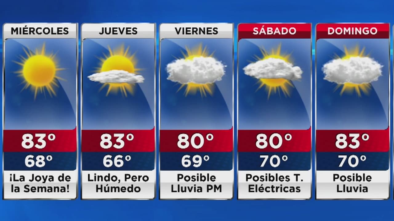 El día de hoy podría ser el mejor de la semana, pues habrá sol y calor, pero con humedad controlada. La temperatura máxima será de 83 grados. El jueves cambiarán las condiciones y aumentarán las probabilidades de lluvia.