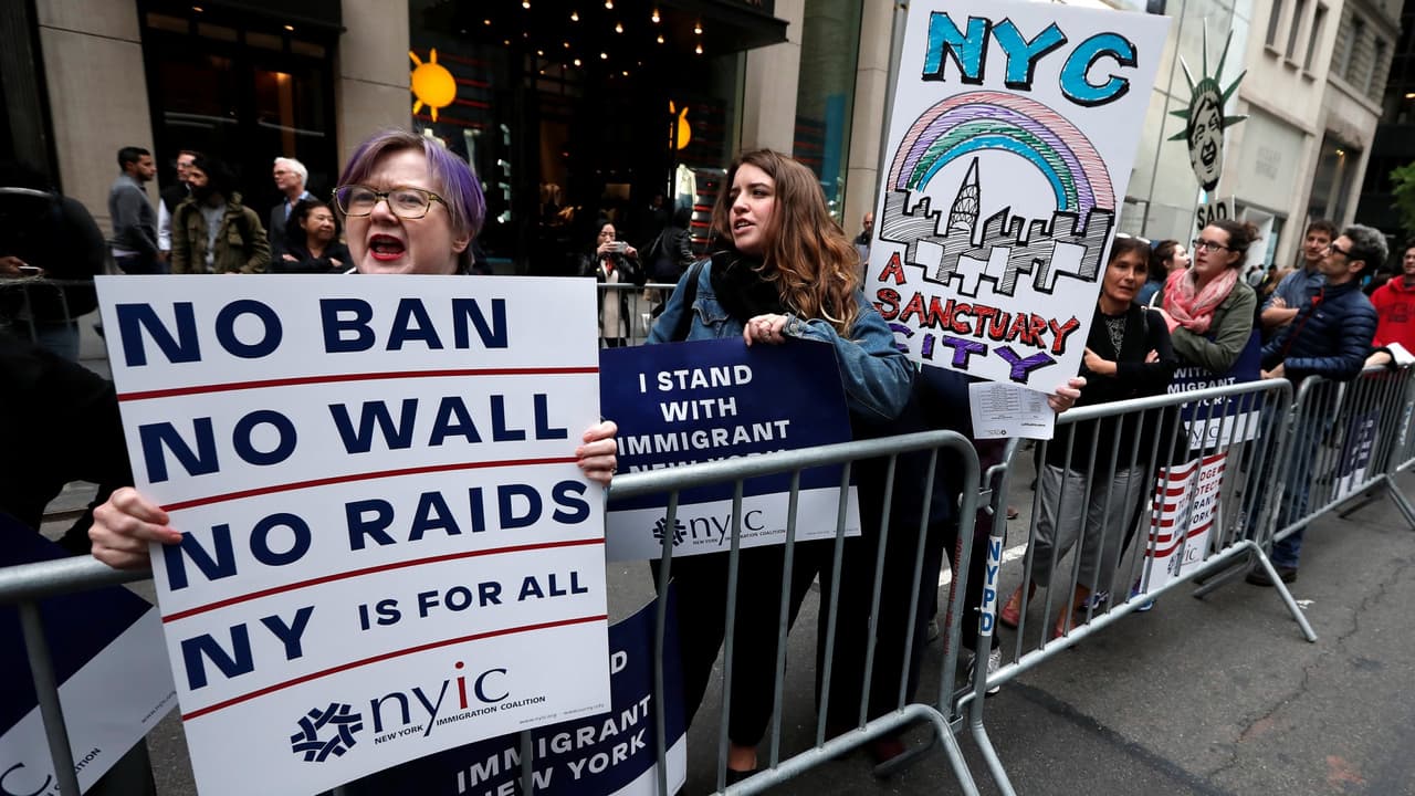 Con carteles, los residentes protestan en West Side Highway, al oeste de Manhattan, contra lo que llaman las políticas de odio, división y opresión.