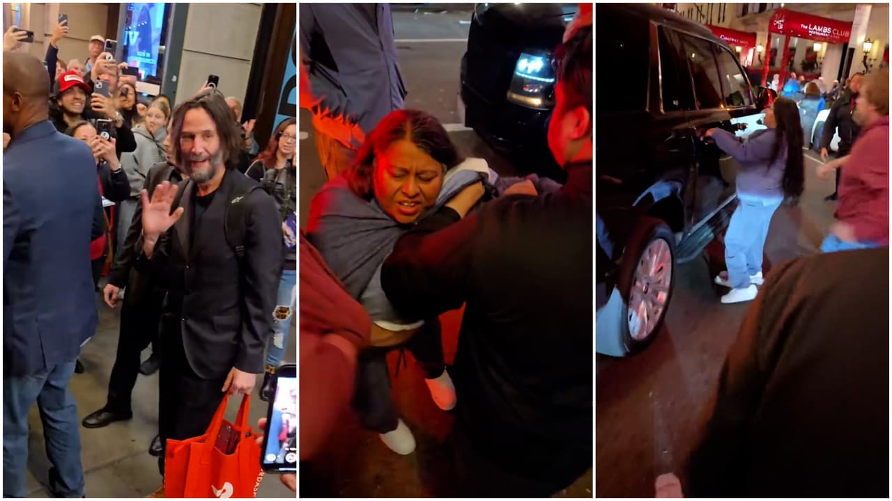 Una mujer intentó acercarse a Keanu Reeves afuera del Teatro Hudson en Nueva York, tras la función de “Esperando a Godot”, gritando que era su “esposa divina”. El hecho ocurrió el 18 de octubre de 2025 y fue captado en video por testigos. El personal de seguridad intervino antes de que la mujer lograra abrir la puerta del vehículo.