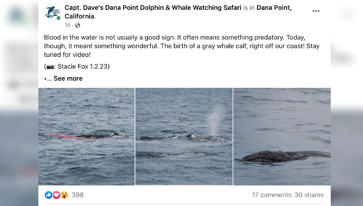 Guías turísticos que llevan más de 25 años navegando esas aguas, nunca habían visto el nacimiento de una ballena gris. El lunes 2 de enero de 2023, en horas de la tarde, una ballena gris de 35 pies parió y presumió su ballenato a un grupo de turistas en Dana Point, California.