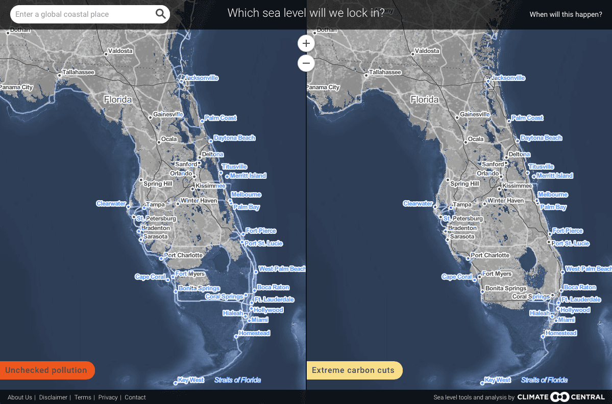 Como explica Strauss, aunque esto puede suceder dentro de mucho tiempo, estos mapas se basan en la cantidad de CO 2 acumulado en la atmósfera en tan solo los próximos 35 años, de aquí a 2050. "Una vez que pones carbono en la atmósfera, permanece allí por cientos y miles de años y sus efectos de calentamiento también", detalla el representante de Climate Central. A partir de esas emisiones, se proyectan los "niveles de mar fijados que son el nivel del mar que se sabe que se va a alcanzar [por este calentamiento calculado], solo que no se sabe cuándo".