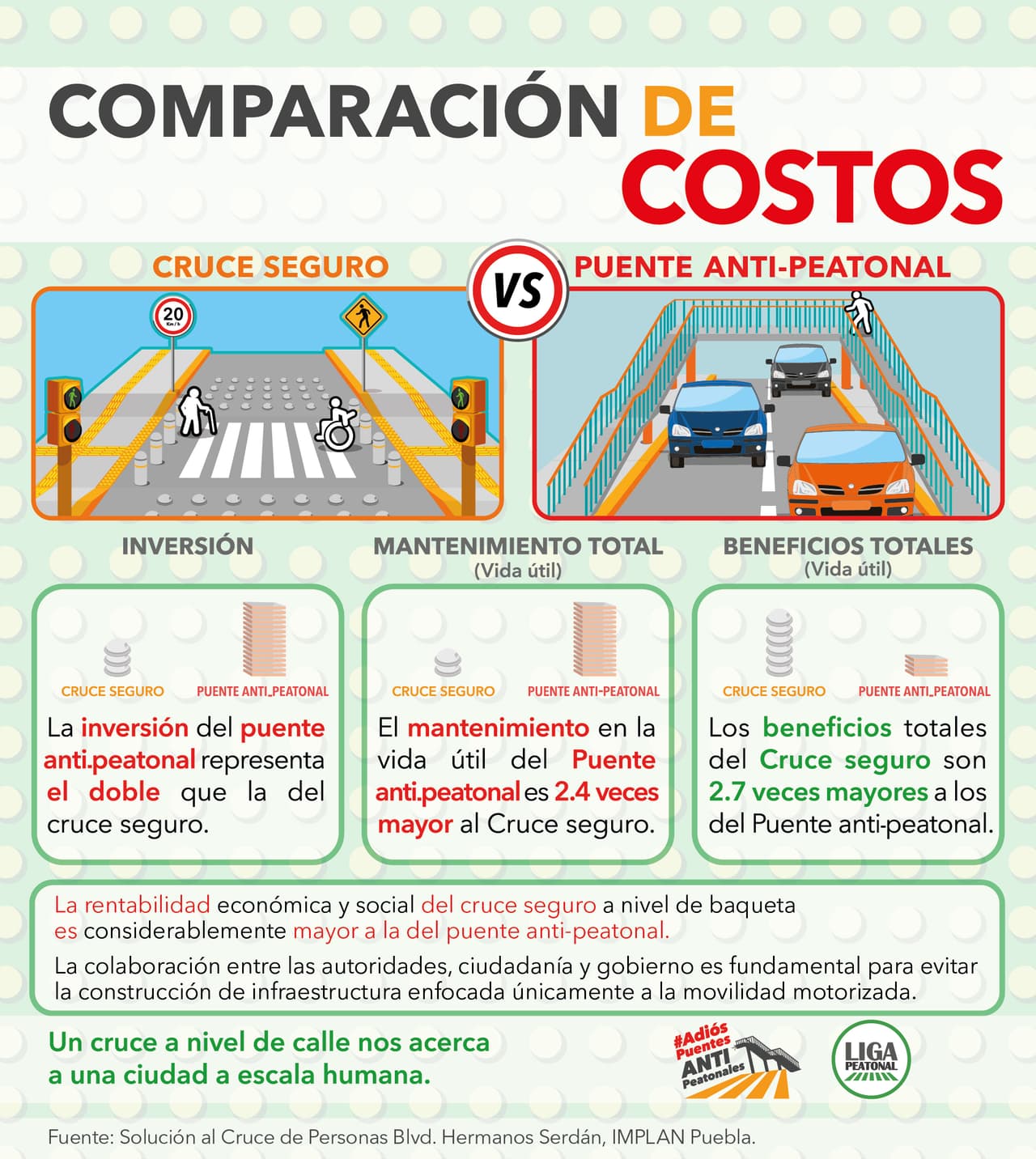 Pero, ¿por qué la Liga Peatonal tiene este desdén frente a estos puentes? Por primero, porque son costosos. Según cifras de la organización, la inversión del puente representa el doble que la del cruce seguro. Además, son ineficaces por su larga distancia. Cruzar por un cruce seguro implica caminar once metros. Los puentes implican 103 metros, lo que elimina la oportunidad de moverse con facilidad para gran parte de la población.